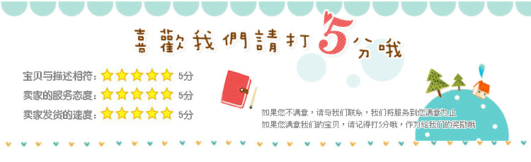 | | 店主精心經營小店,對待每一位有緣的朋友都會真誠相待,親們收到商品後,有任何不滿意都可以找店主協商,一定給您滿意的答復,請不要輕易給中差評,讓我們相互理解,共同進步吧~如果您還算滿意,請給我們打五分,非常感謝。 |
