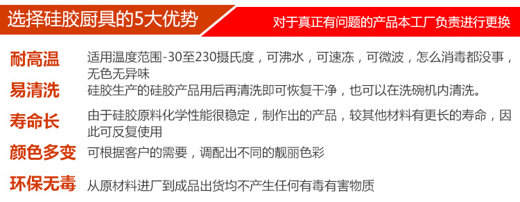 產品質量:材質優良,食品級矽膠,無毒無味,對食物無任何污染、柔韌度、產品表麵耐磨度、符合國際安全及衛生標準。使用安全,可放置在各種地方,收納方便。外形簡潔大方,可以體現出廚房客廳的時尚感。使用方便,清洗方便。測試標準:FDA/食品級
