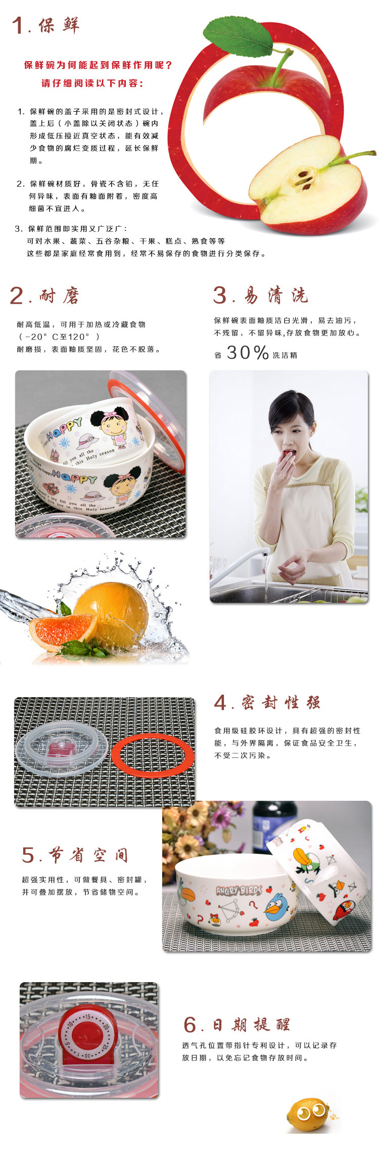 保鮮原理:骨瓷保鮮碗,采用略大於碗口的環形蓋設計,使蓋於碗緊密結合,關閉透氣孔內部形成低壓接近真空狀態,杜絕細菌侵入,滋生,有效延長食物保鮮期