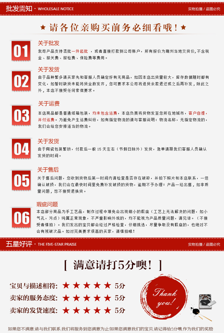 批發一律走物流到付,3天左右發貨,易碎物品,不接急件。