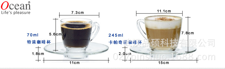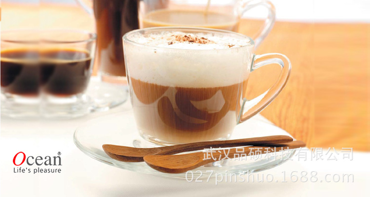 - 亞洲頂級玻璃器皿公司泰國Ocean原裝進口,卡帕奇諾的經典套裝款式,高品質透明玻璃材質,無鉛環保純凈透亮,西式餐飲中的咖啡杯和茶飲杯,餐飲咖啡店必備常用杯型。