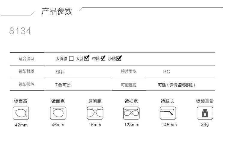| 鏡框顏色 | 1、亮黑框,2、上藍下紫框,3、豹紋框,4、棕色框,5、砂黑框,6、玳瑁框,7、紅框 |