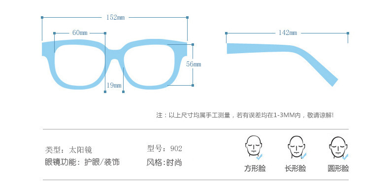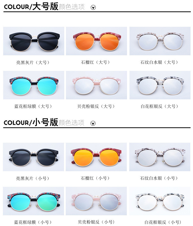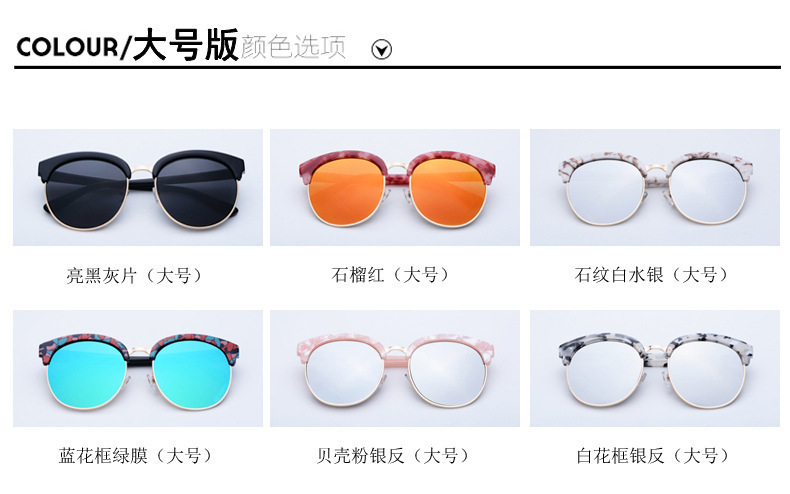 | 鏡片顏色 | 圖片色 | 鏡架顏色 | Q2-902亮黑灰片(大號),Q2-902石紋白水銀(大號),Q2-902白花框銀反(大號),Q2-902貝殼粉銀反(大號),Q2-902藍花框綠膜(大號),Q2-902石榴紅(大號),Q3-5005石紋白水銀(小號),Q3-5005亮黑灰片(小號),Q3-5005白花框銀反(小號),Q3-5005藍花框綠膜(小號),Q3-5005石榴紅(小號),Q3-5005貝殼粉銀反(小號) | 貨號 | Q2-902、Q3-5005 |