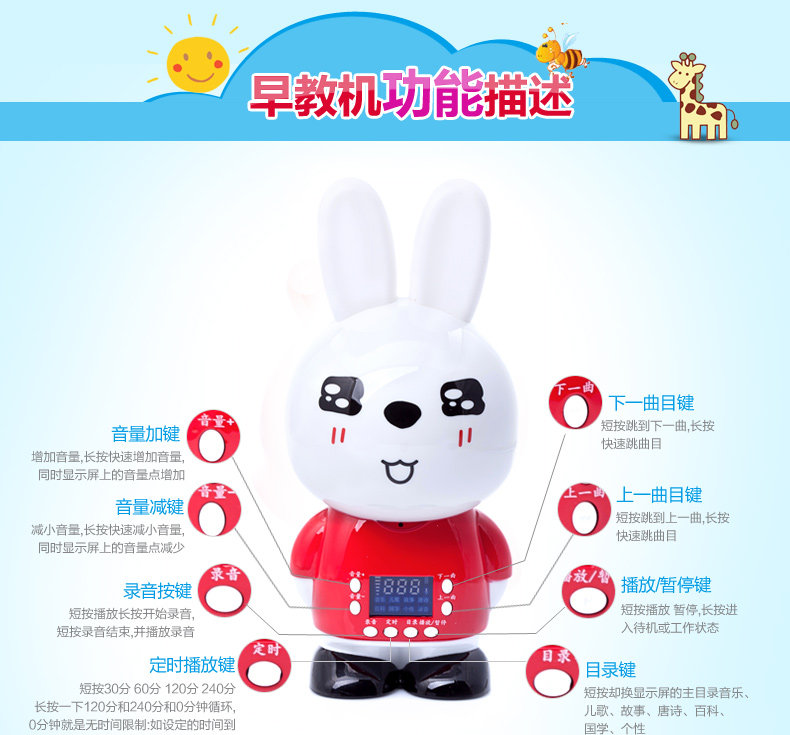 | 建議零售價 | ¥188.00 | 類別 | 早教/幼教故事機 | 功能 | 音樂/發聲,閃光,錄音,可下載,可充電,遙控 |