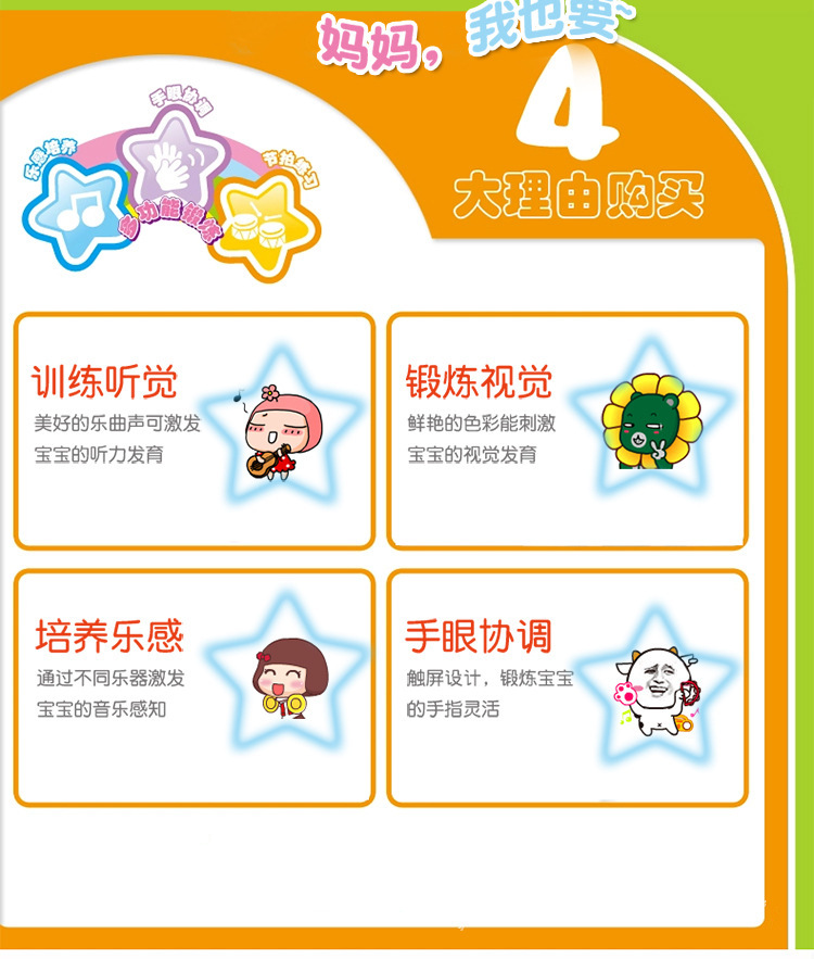 | 能力培養 | 智力開發,興趣培養,親子交流,情感,聽覺,互動玩具,感官,手眼協調,視覺 | 貨號 | 0185 | 是否有動漫形象 | 否 |