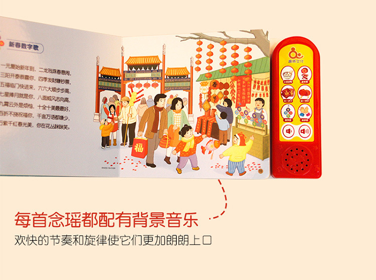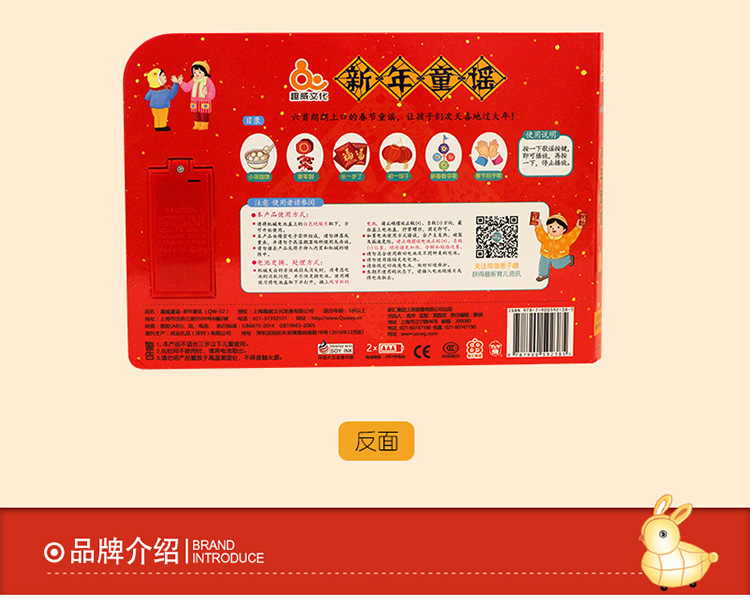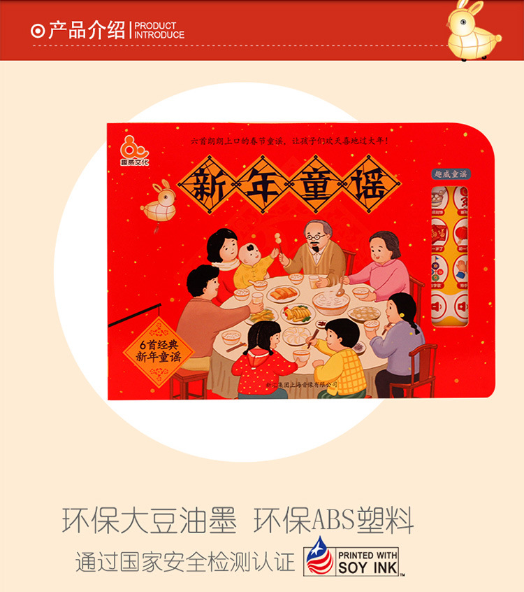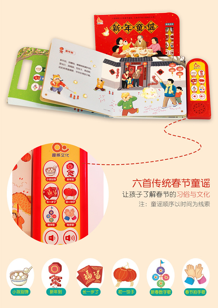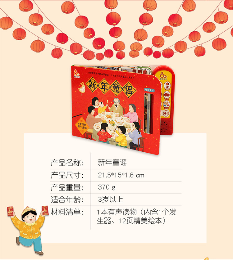 | 能力培養 | 智力開發,動手動腦,聽覺,感官,手眼協調,其他能力培養 | 貨號 | 新年童謠 | 是否有動漫形象 | 否 |