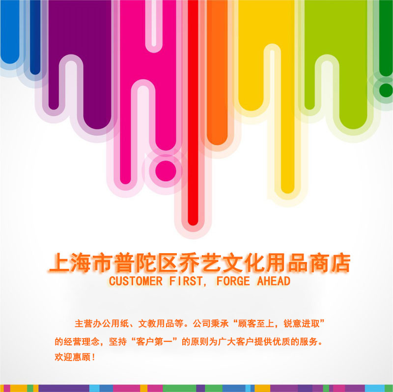 上海市普陀區喬藝文化用品商店主營辦公用紙、文教用品等。公司秉承“顧客至上,銳意進取”的經營理念,堅持“客戶第一”的原則為廣大客戶提供優質的服務。歡迎惠顧!