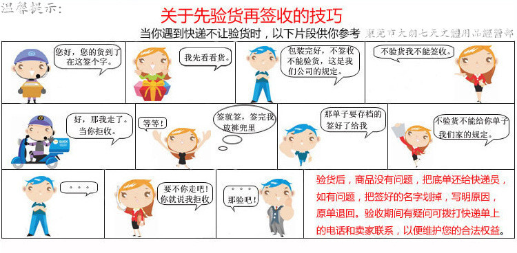 | 3、如有質量問題,請親先提供相關證據,待客服確認後,參照退貨流程進行退換貨。退至七天售後的快件請勿發平郵及運費到付件,否則無法為親辦理退換處理。 |