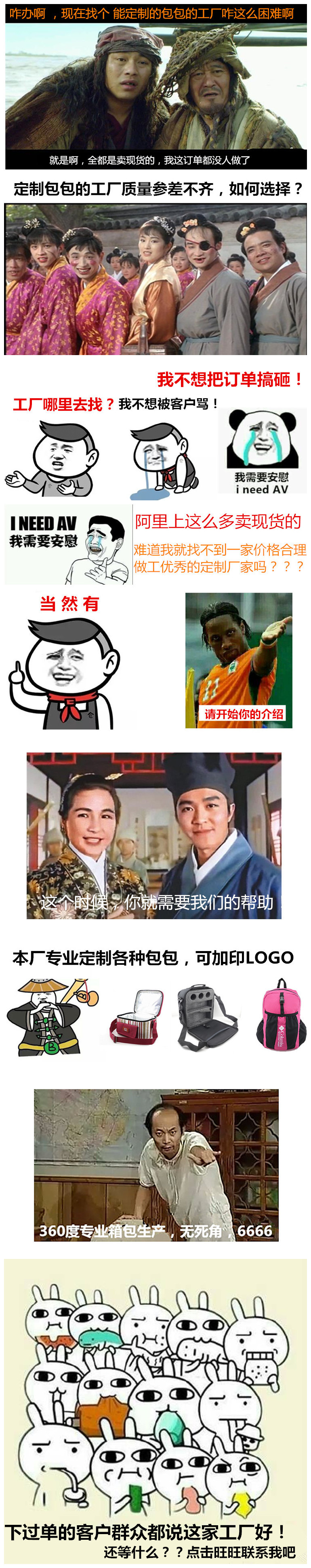 箱包廠主要從事生產、加工、銷售等業務,公司擁有一批銷售業務精英及技術精湛的設計人員,開發時尚箱包、手提包,手袋、化妝包,禮品袋、無紡佈袋帆佈袋,時裝包,冰包、野餐包 ,零錢包,筆袋,手機袋,電腦包,登山包品款式新穎,質量上乘,價格優惠,竭誠為廣大客戶提供優質服務。經過多年的不懈努力,公司現已建立良好的銷售網路,產品遠銷世界各地,深受國內外客戶的好評。公司有專門人員註意收集國際市場的各種流行趨勢和時尚信息,因此我們每周都會推出新的款式來滿足不斷變化的市場需求.我司也竭誠歡迎你的來樣定做和貼牌生產.我們的服務宗旨:以“客戶第一,質量第一,信譽至上”為經營宗旨,公司實力雄厚、設備齊全、可開17%的增值稅發票,歡迎新老客戶來人來電洽談業務,真誠合作,共創輝煌 |