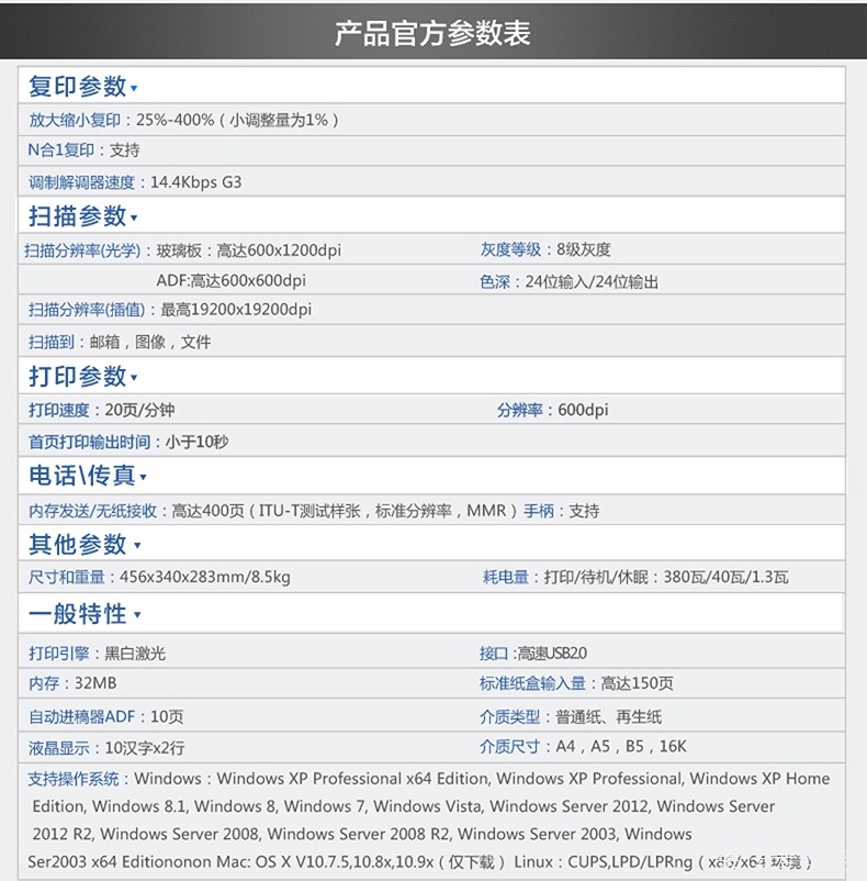 | 規格 | 456×340×283mm | 涵蓋功能 | 打印,復印,掃描,傳真,WiFi | 打印尺寸 | 210*297(cm) |
