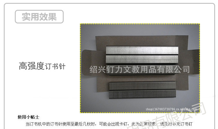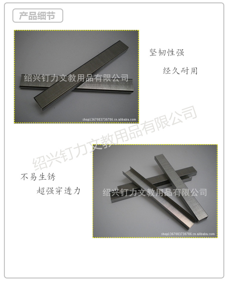 - 紹興釘力文教用品有限公司成立於2007年,是一傢專業生產各類文教釘,工業釘,不銹鋼釘,彩色釘的訂書釘生產加工廠傢,坐落於風景秀麗,經濟發達的魯迅故鄉,文化旅遊名城--紹興,緊靠杭甬高速公路,西連杭州市,東接寧波港,杭甬鐵路、104國道、329國道通過,交通便利。我們擁有完整、科學的質量管理體系。我們的誠信、實力和產品質量獲得業界的認可。歡迎各界朋友蒞臨參觀、指導和業務洽談。