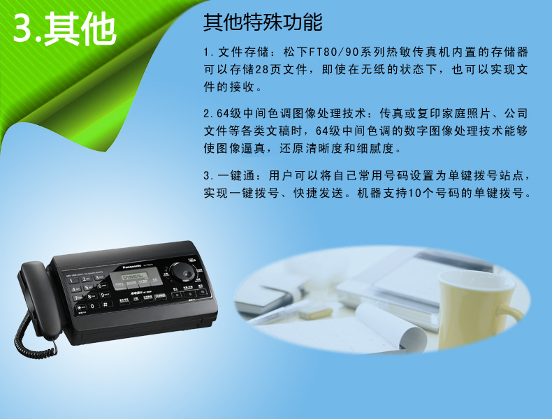 | 適用紙張(打印方式) | 熱敏紙 | 連續復印頁數 | 28 | 撥號存儲 | 有 |