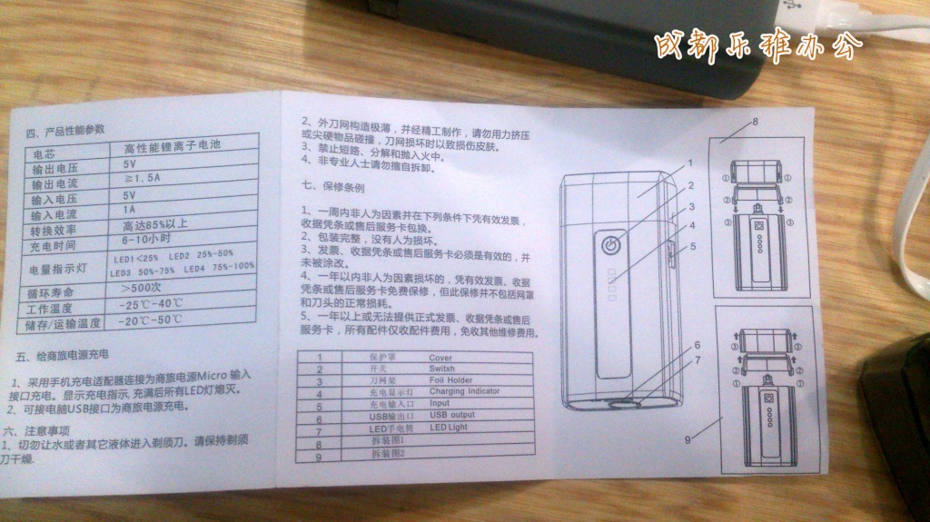 3、一年以內非人為因素損壞的,憑有效發票、收據憑條或售後服務卡免費保修,但此保修並不包括網罩和刀頭的正常損耗。