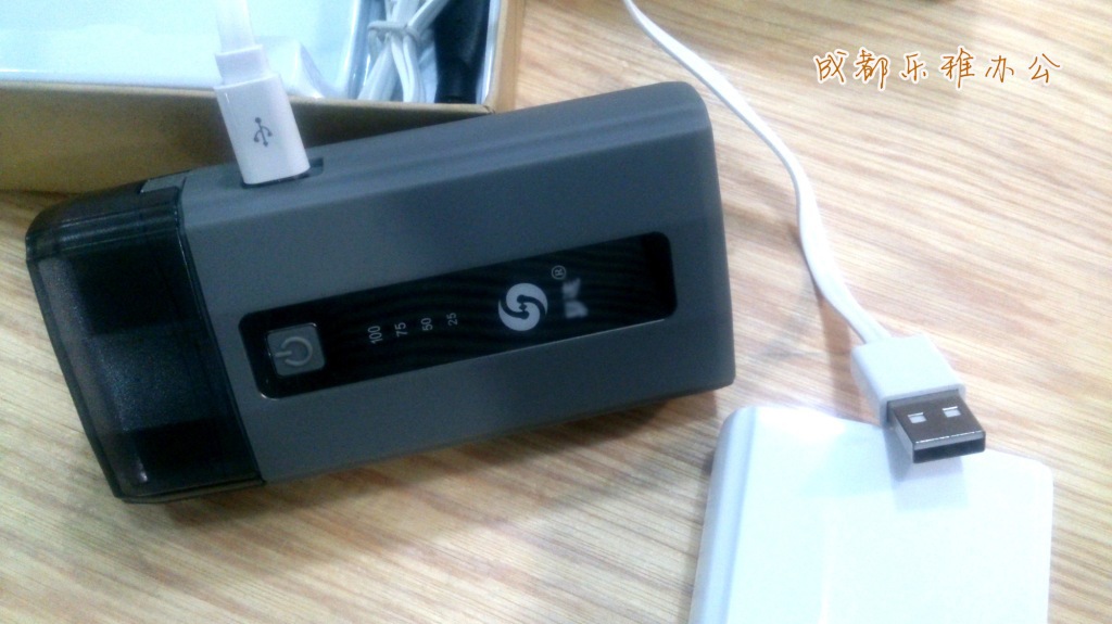 采用手機充電適配器連接為商旅電源Micro 輸入介面充電。顯示充電指示, 充滿後所有LED燈熄滅。