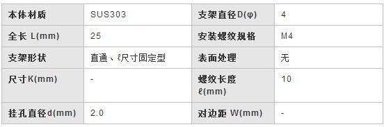 | 支架直徑D(φ) | 4 | 全長 L(mm) | 25 | 本體材質 | SUS303 |