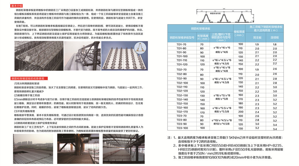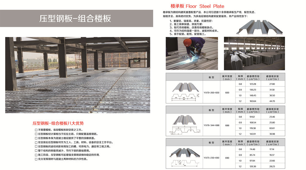 公司團隊本著對中國鋼結構事業的熱誠,積極開拓,敢為人先,不斷提高生產技術和產品服務水平,力爭更好的為全球客戶提供物超所值的產品。公司現有鍍鋅鋼承板20餘種型號,厚度0.8-1.2mm,涵蓋閉口、開口樓承板等,年銷售額上億元。同時還可以根據客戶圖紙加工相對應的樓承板板型,為客戶提供更全麵的服務。