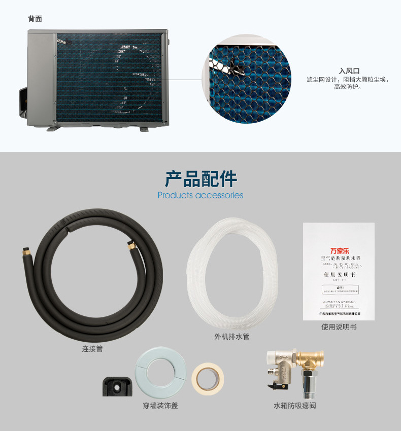 | 進水方式 | 下進水 | 加熱功率(KW) | 1.1kW(含)-2kW(含) | 包裝清單 | 主機、水箱、連接管、外機排水管、穿墻裝飾蓋、水箱防吸癟閥、使用說明書 |