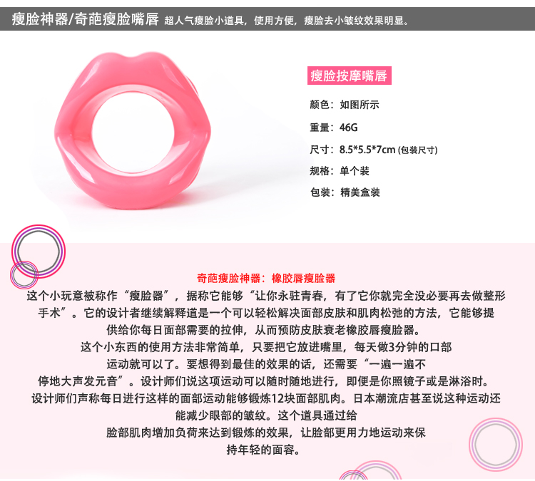 這個小玩意被稱作“瘦臉器”,據稱它能夠“讓你永駐青春,有瞭它你就完全沒必要再去做整形手術”。它的設計者繼續解釋道是一個可以輕松解決麵部皮膚和肌肉松弛的方法,它能夠提供給你每日麵部需要的拉伸,從而預防皮膚衰老橡膠唇瘦臉器。