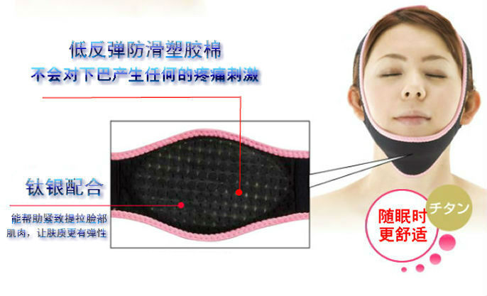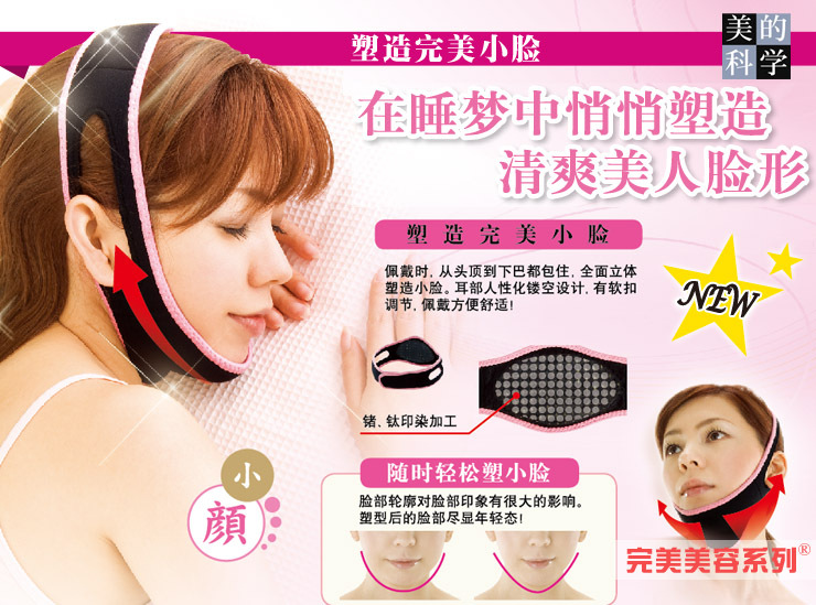 溫馨提示 使用時,請小心指甲,以免抓破佈料。 感到緊繃時,請註意適當調節。 適應後可逐漸增長使用時間。 【產品特點】 1.透氣性好,肌膚觸感舒服. 2.低反彈素材,觸感舒適,輕柔持續壓力,有效達到小顏效果。 3.麵對頭皮的一麵,為瞭提高強度,防滑且采用天然橡膠. 【寶貝效果】 臉部成型帶,在睡眠中從頭皮開始對臉部立體提升起到支持作用.按照整體物理學原理,使沒有松弛的皮膚,肌肉位置被記憶,使臉型一直處於年輕的最佳狀態為目標.加之特殊設計,並在發際部分采用防滑天然橡膠,更加嚴密緊貼.和目前一般的小臉成型帶產品相比較,這款產品是實現瞭到目前為止還沒有從頭皮開始立體提升麵部的新產品,戴上後瞬間就有從頭開始向上張引的感覺,整個臉部肌肉都有被提升的真實感。
