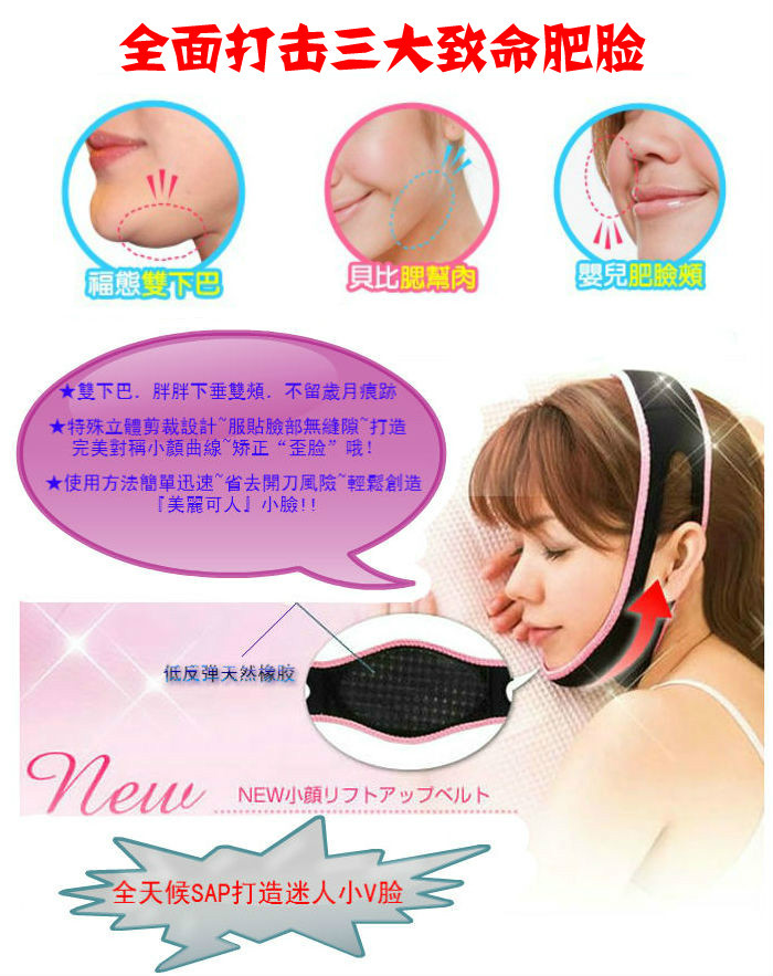 ★雙下巴.胖胖下垂雙頰.歲月痕跡表情筋一點不留!! ★看起來年輕更有精神~活力再現~給妳滿滿的自信唷!! ★特殊立體剪裁設計~服貼臉部無縫隙~打造完美對稱小顏曲線~矯正“歪臉”哦! ★使用方法簡單迅速~省去開刀風險~輕鬆創造『美麗可人』小臉!! ★適合傢居生活使用~配合泡澡.做傢事或室內運動~讓您的臉部輕鬆做SPA~高效利用睡眠時間~偷偷變小臉! 材質:錦綸100%、裡料:滌綸100% 型號:均碼