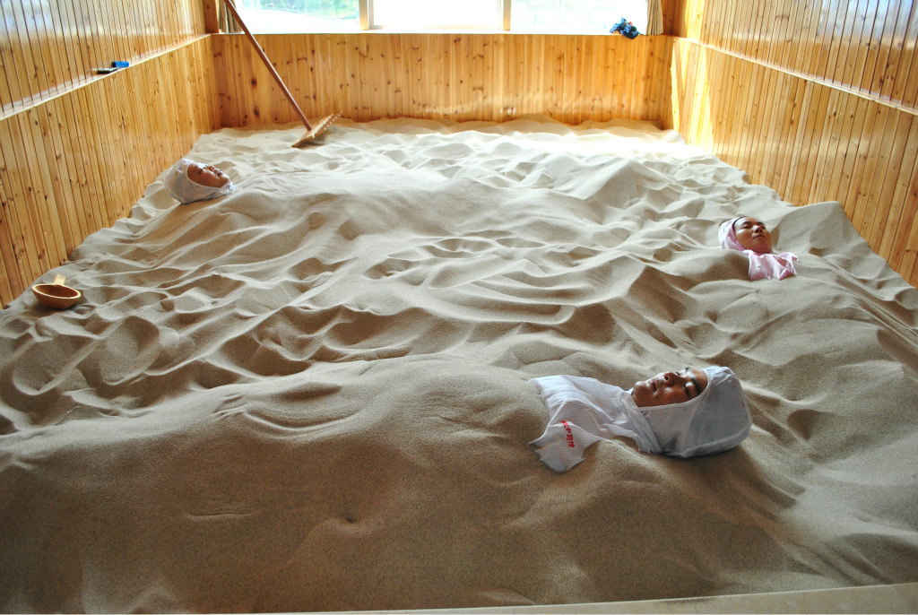 浴其功效,是透過沙粒的高溫使人體毛孔擴張,促進血液循環,排出汗水和積聚在