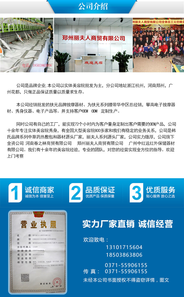 本公司是中原地區最大的減肥器材批發商,有十餘年的瘦身按摩產品運作經驗。我們以前做實體,雖然我們是新阿裡店,但是我們的產品品質價格絕對是同行中姣姣者,該產品上麵字體可以定製,扶元和中藥熱敷震脂帶隻是兩種外觀標示,上麵字體可以根據美容院需要定製,以上批發價格含240g瘦身中藥包。