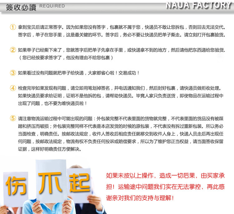![]() | 簽收 | 簽收包裹是請務必當著快遞員的麵,打開包裹檢查商品是否損壞,核對數量是否正確,如發現問題請拒簽。一旦簽收視為商品以認可。 |