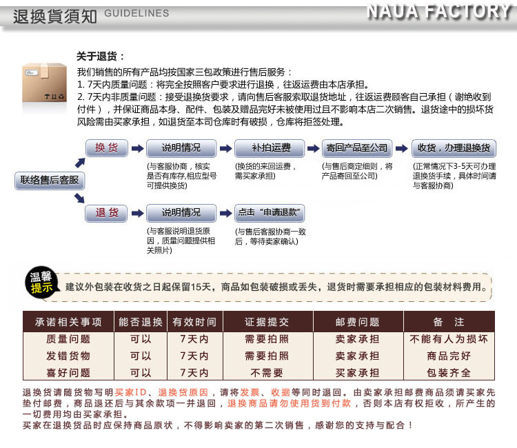 ![]() | 退換貨 | 我們支持7天無理由退貨,質量問題賣傢承擔回運車費,非質量問題由買傢承擔車費。(註意:收到包裹請務必及時檢查, 質量問題請在簽 收後兩天內聯系我們,否則我們無法 判定質量問題是發貨是照成的還是買傢照成的。) |