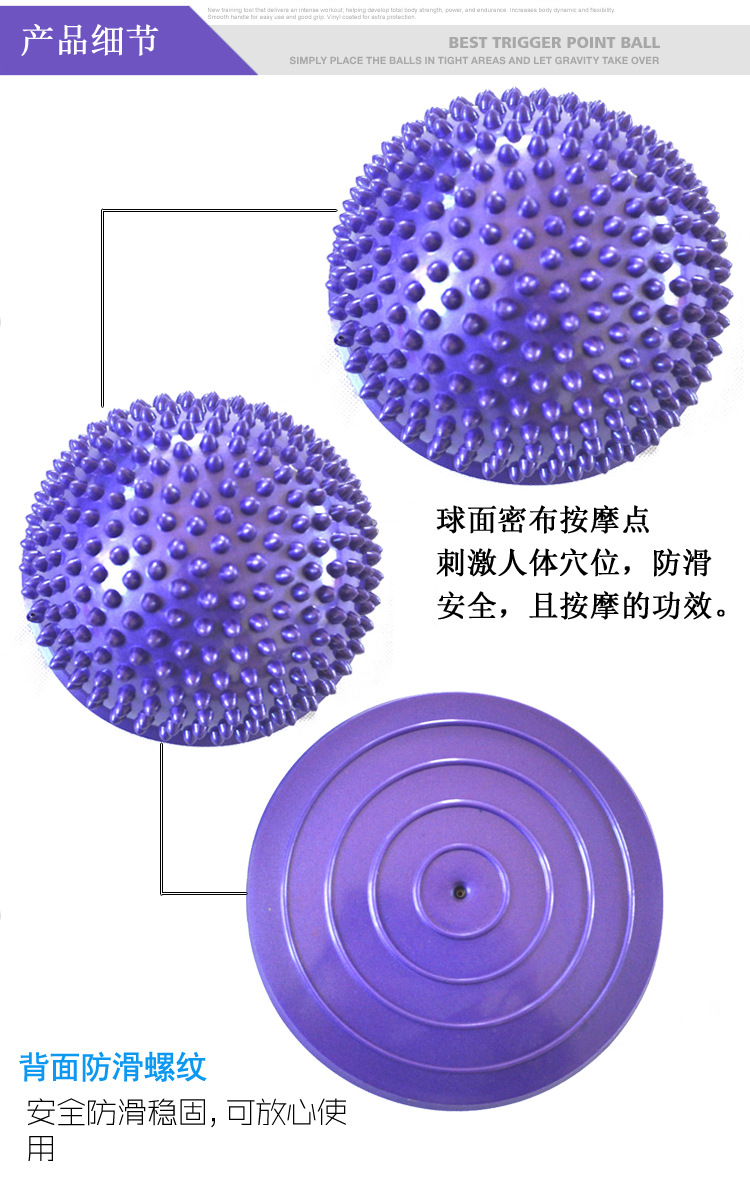 用途:按摩保健。長期鍛煉,有益健康. 球體表麵的觸角軟硬適中,按摩你的肌膚,刺激神經末梢,可促進血液循環, 放松緊張的神經,增強身體的靈活性.也可以在你頭疼時用小按摩球在頭上輕輕滾動,會感覺舒服許多;感冒時按摩背部,會比單純用手按摩更輕松。是一個用於增進核心肌肉訓練的平衡和穩定性的一種非常好的訓練工具
