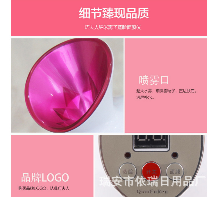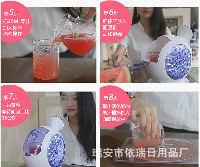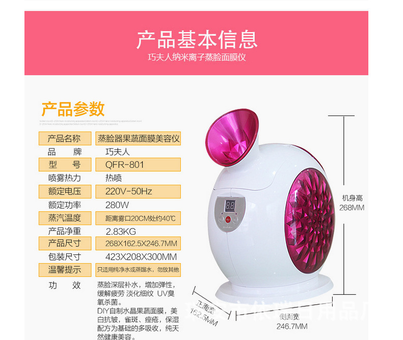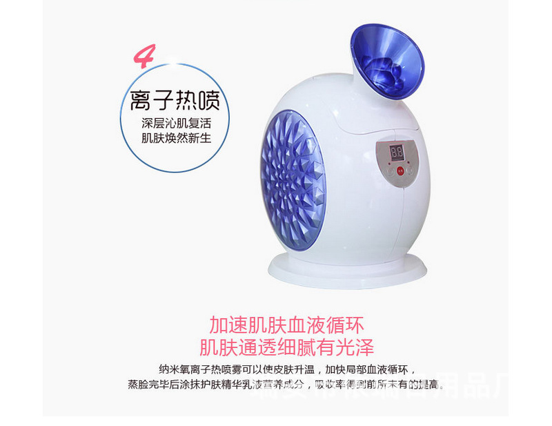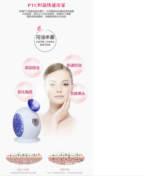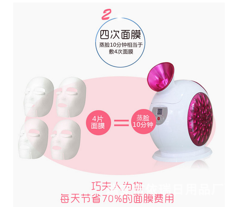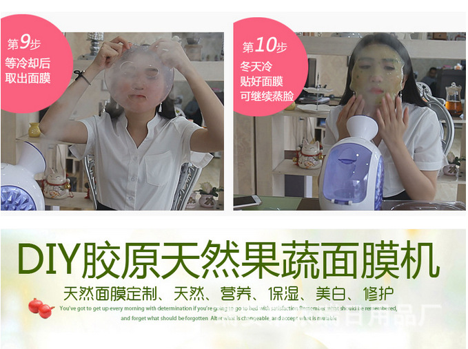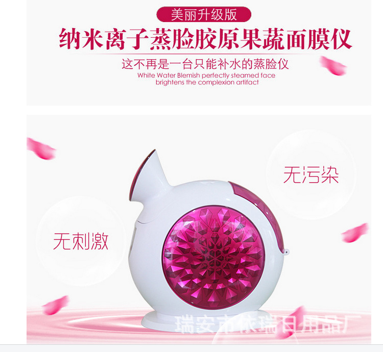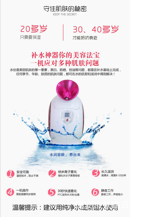 功效:蒸臉深層補水,增加彈性,緩解疲勞,淡化細紋,UV臭氧殺菌。DIY自製水晶果蔬麵膜。美白抗皺,雀斑、痤瘡,保濕配方為基礎的多吸收,純天然健康美容