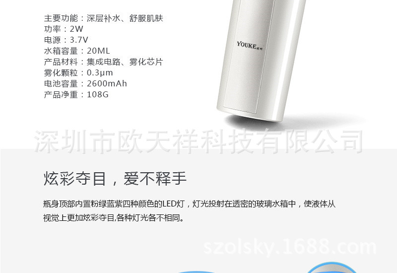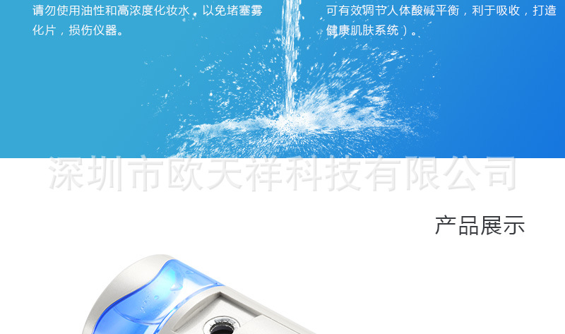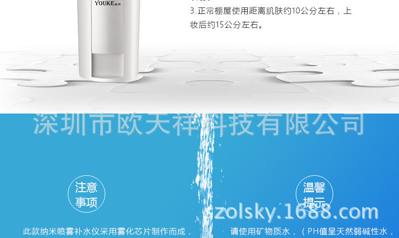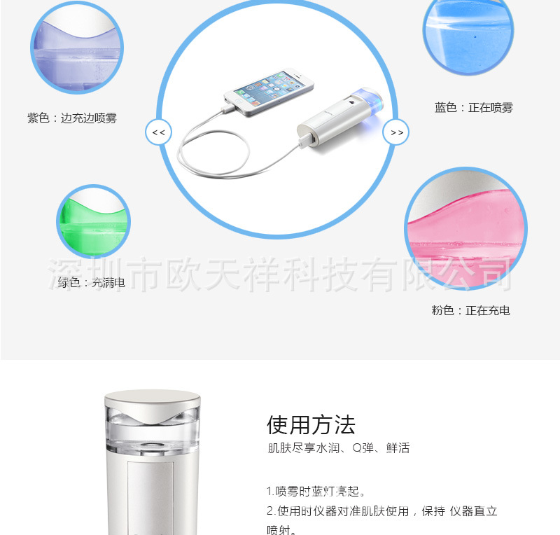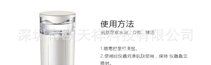 | 1.本產品采用納米霧化技術,能夠將水快速細微量化,形成極小的微粒子噴射至皮膚表麵,並高效滲透進入肌膚的底層,給肌膚最完美的保濕護理。 |