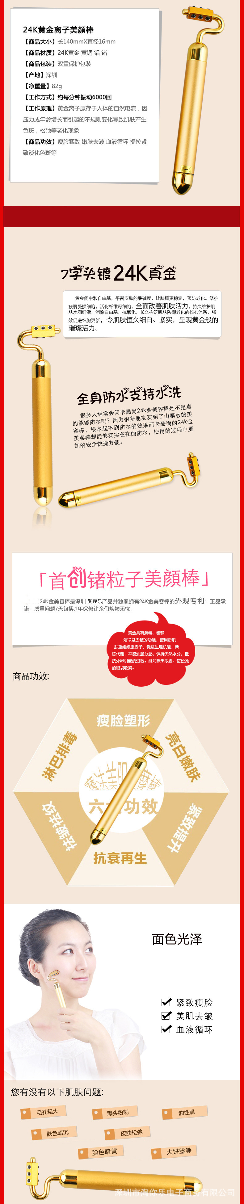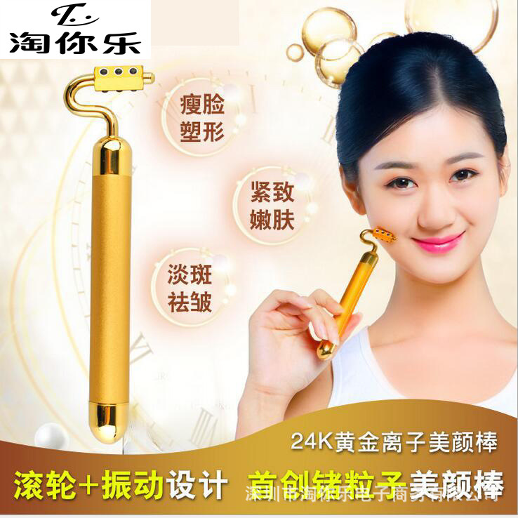 24K金美容棒,鍍黃金T字頭部,每分6000次震動,全身防水設計,有效解決皺紋 、松弛,斑點,暗沉,水腫等問題,打適緊致的麵部肌膚,具備瘦臉的功能 ,每天使用3分鐘,可以讓你神奇的變成眾人矚目的錐子明星臉。