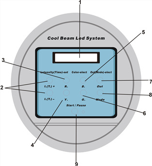 1、液晶顯示窗 2、工用時間/光能量調節鍵 3、紅光設定鍵