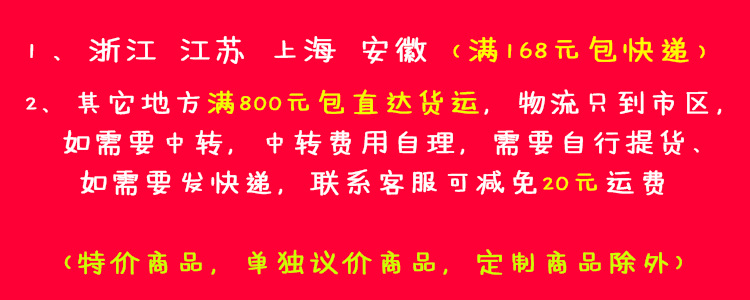 | | 在線時間 | | 周一至周六8:00-00:00 周日09:00-23:00 節假日休息請關註店鋪公告 | | 關於郵費和物流 | | 本店物流走中通、圓通、韻達,拒發申通。其中,中通為默認快遞,郵費模板僅針對中通設計。江浙滬皖湘鄂贛閩粵冀魯的朋友三傢快遞隨機發貨,其它地區需要走圓通韻達的親請聯系客服補郵費差價。(青海、甘肅、寧夏、內蒙古、海南需要加5元,新疆、西藏需要加10元) |