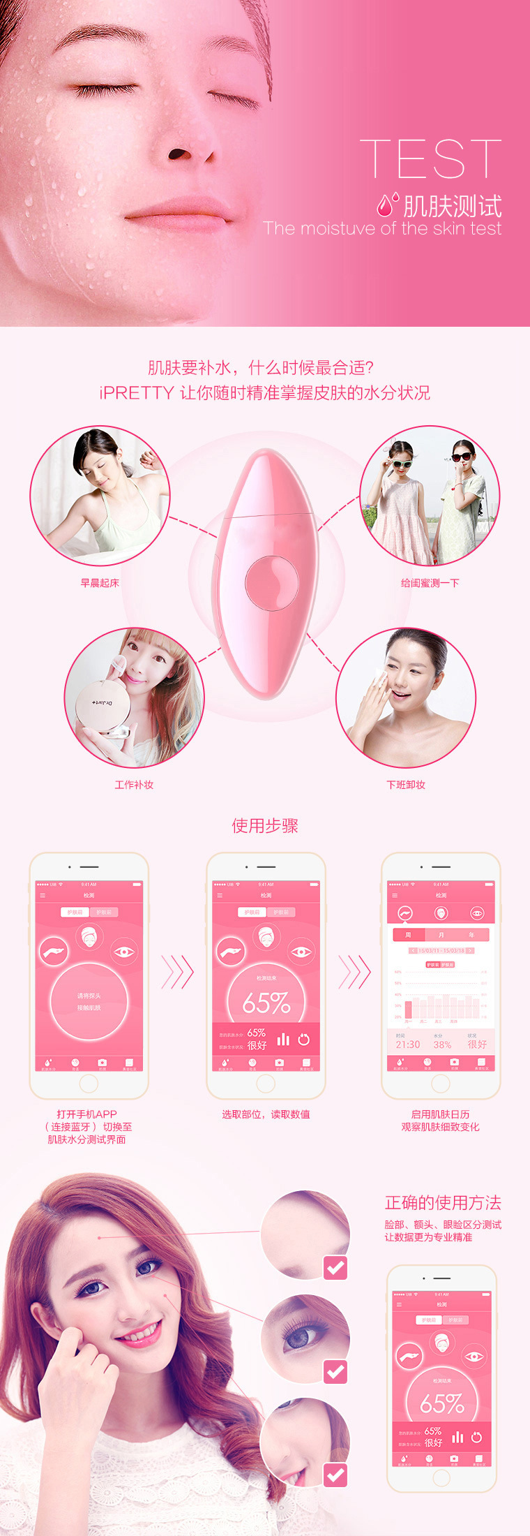 答:這個問題是很多親反應最大,也是最多的一個問題。其實原因大多數,就是使用方法不正確。如果開機後立即把探頭貼在皮膚上是測不出準確數值的,數值會上下浮動很大測試不穩定的現象;很多MM們一拿到皮膚測試筆後沒有看說明書,直接憑感覺就測試瞭,這樣即時測出來數值是不具備參考價值的。親,可以先看一下說明書或者聯系客服我們有操作視訊。