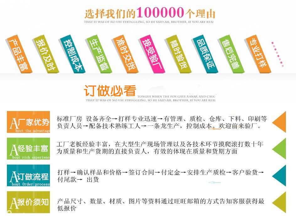 工廠擁有領先的企業管理和企業文化,有一批優秀的銷售團隊、業務跟單。分工明細,嚴格把關,重重審核,先核對再確認樣品後生產,生產工序由質檢部專業QC檢驗,確認產品合格後方可交貨。在確保品質貨期準確的同時,有專業的售後客服人員對客戶進行回訪,在最大程度上減少了客戶和公司的損失,令客戶感受到我們的優質服務。