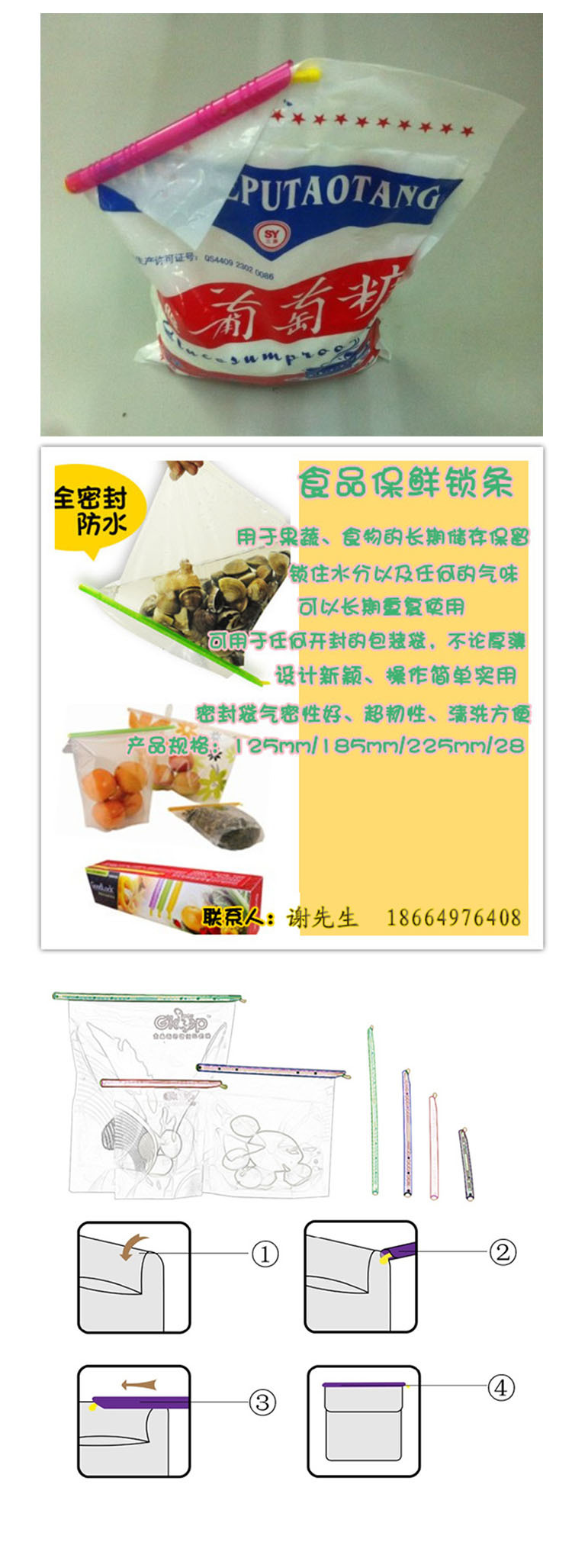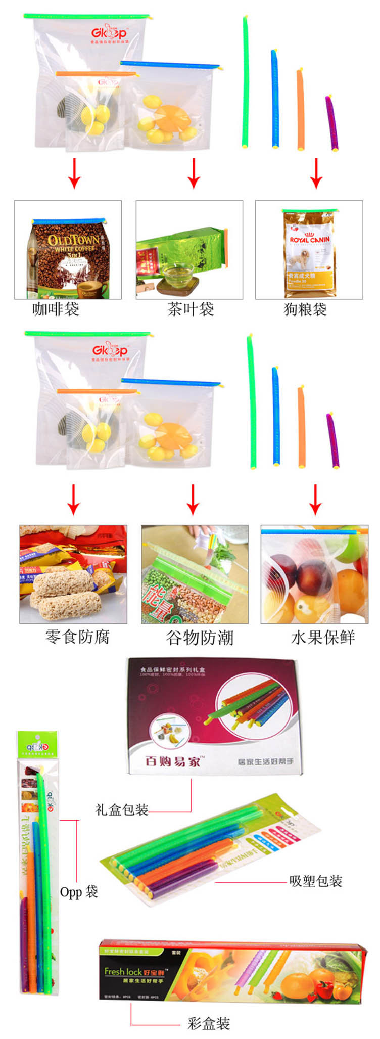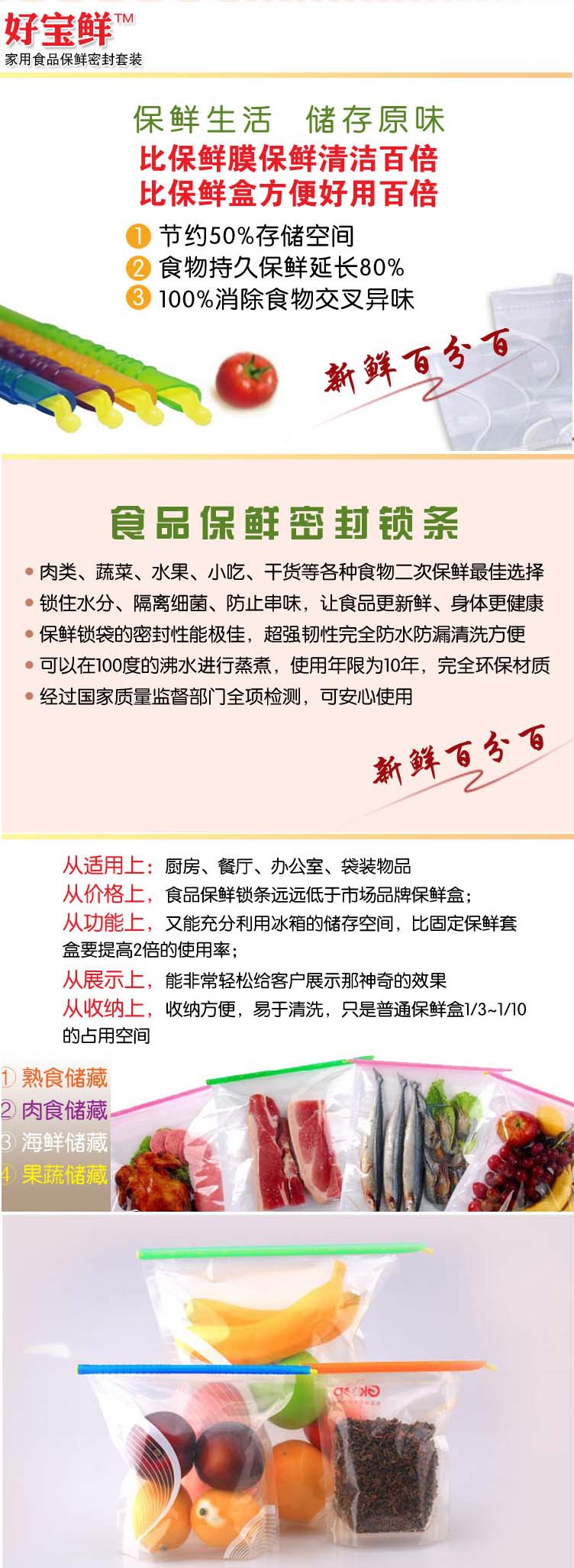 該產品用於果蔬,食物的長期儲藏保留,鎖住水分以及任何的氣味,可長期重複使用。密封鎖條可用於任何開封的包裝袋,簡單新穎的設計,操作簡單實用。密封袋氣密性好,超韌性, 清洗方便,亦可重複使用。
