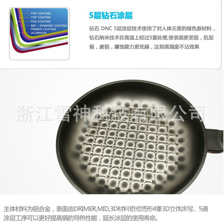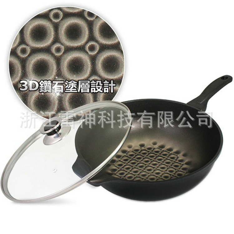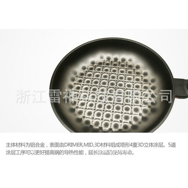 鍋體採用3D鑽石塗料,在烹飪過程中3D立體塗層隨著溫度的變化3D花紋會跟著發生變化,同時能夠加強及延長涂層的壽命