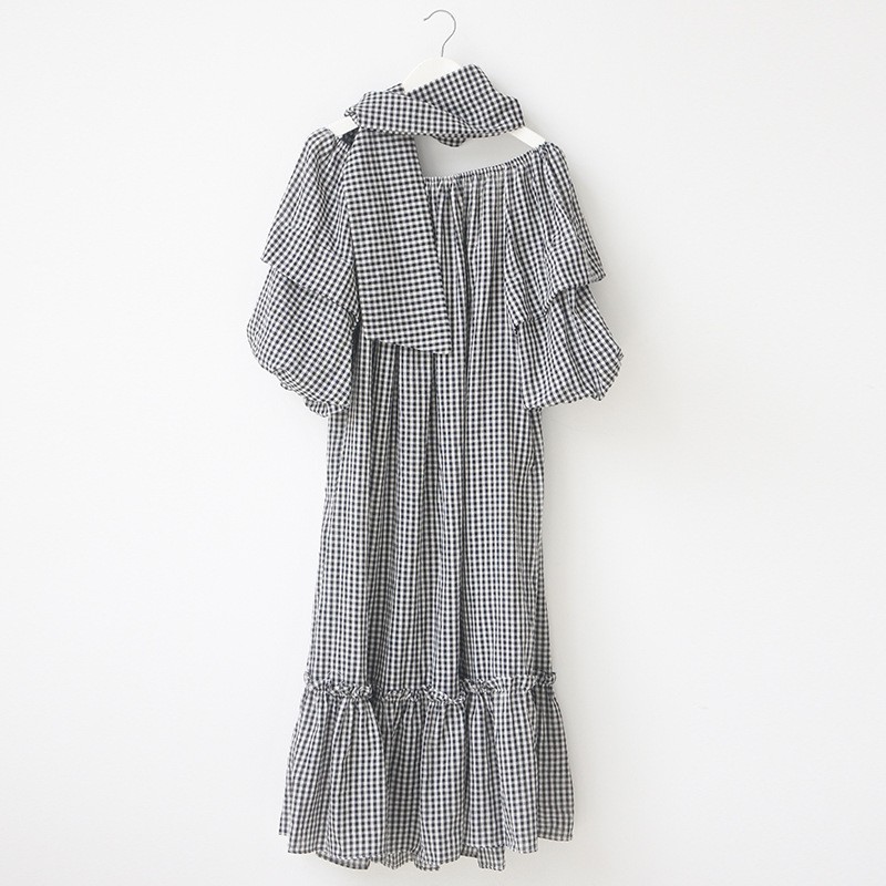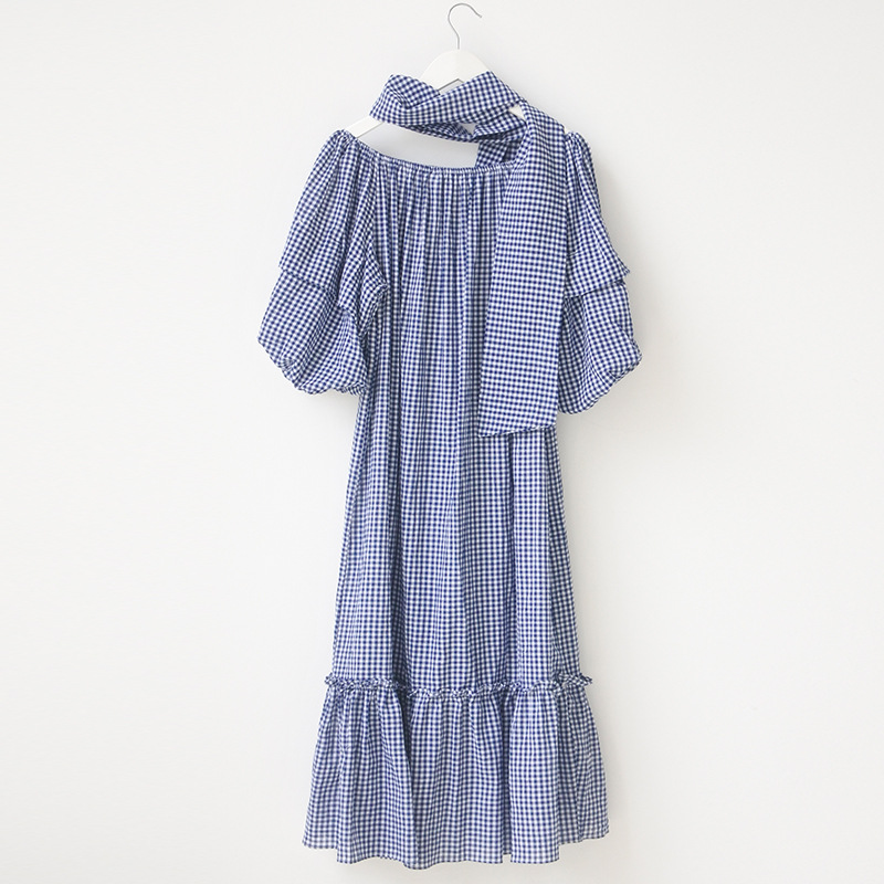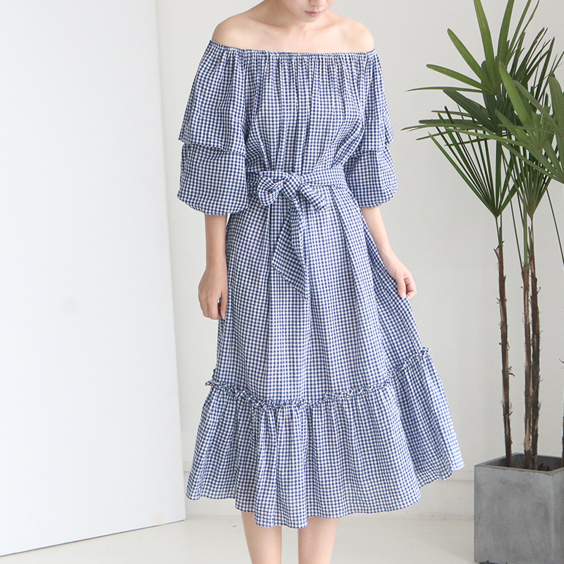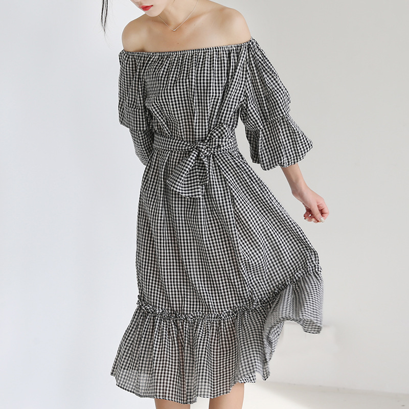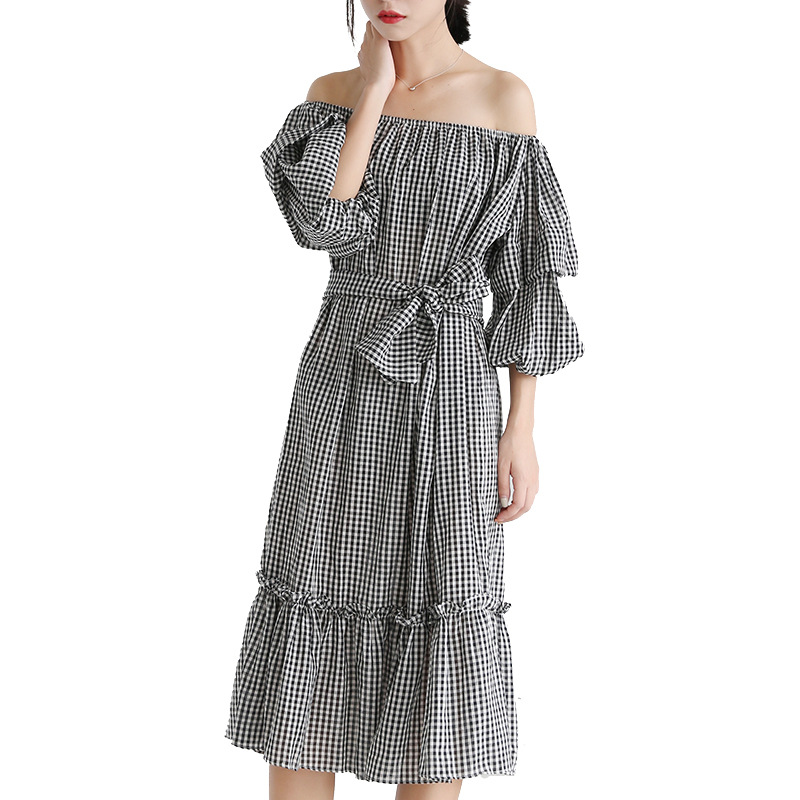 格子麵料一字肩今夏非常流行中長款連衣裙配同色麵料腰帶