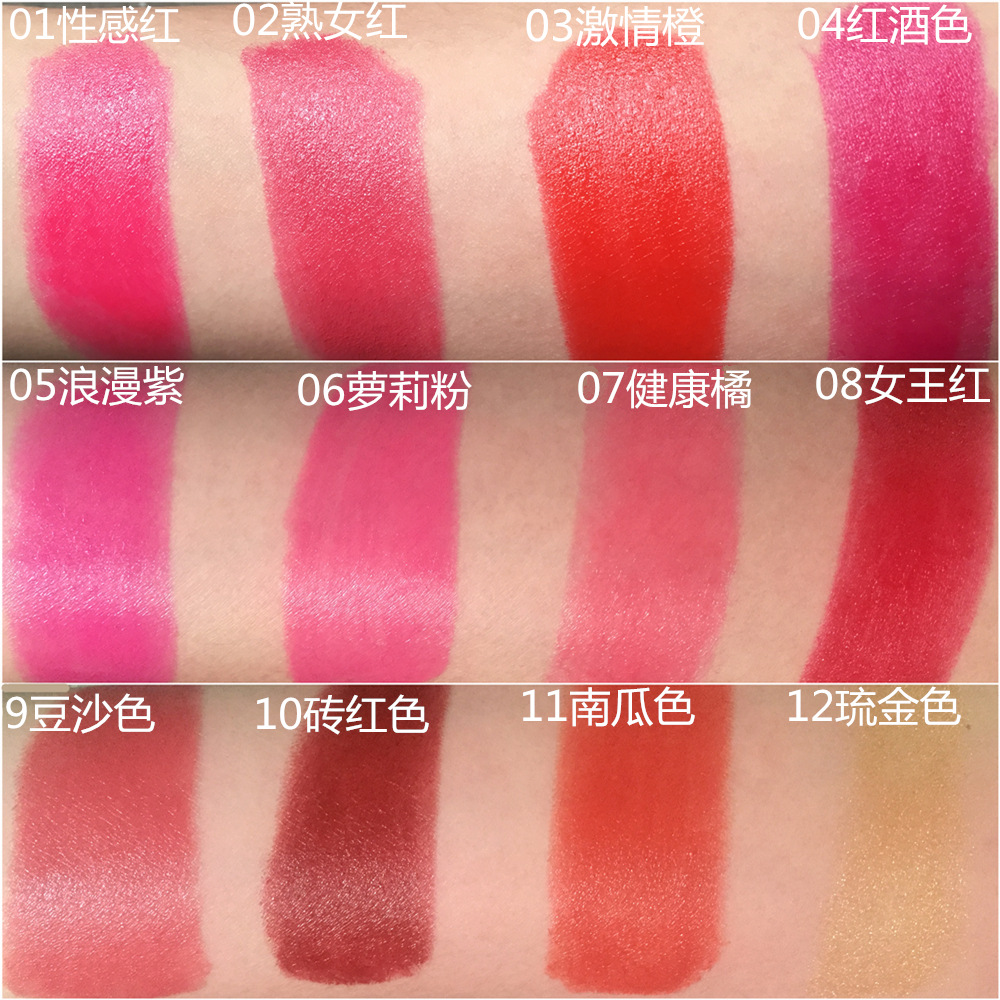 淨含量:01性感紅,02熟女紅,03激情橙,04紅酒色,05浪漫紫,06蘿莉粉,07健康橘,08女王紅,09豆沙色,10磚紅色,11南瓜色,12琉金色