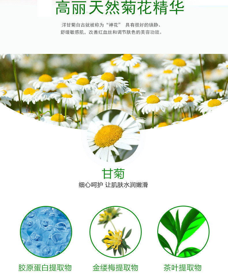 2,富含洋甘菊提取,對敏感性膚質有鎮定、舒緩效果   ;