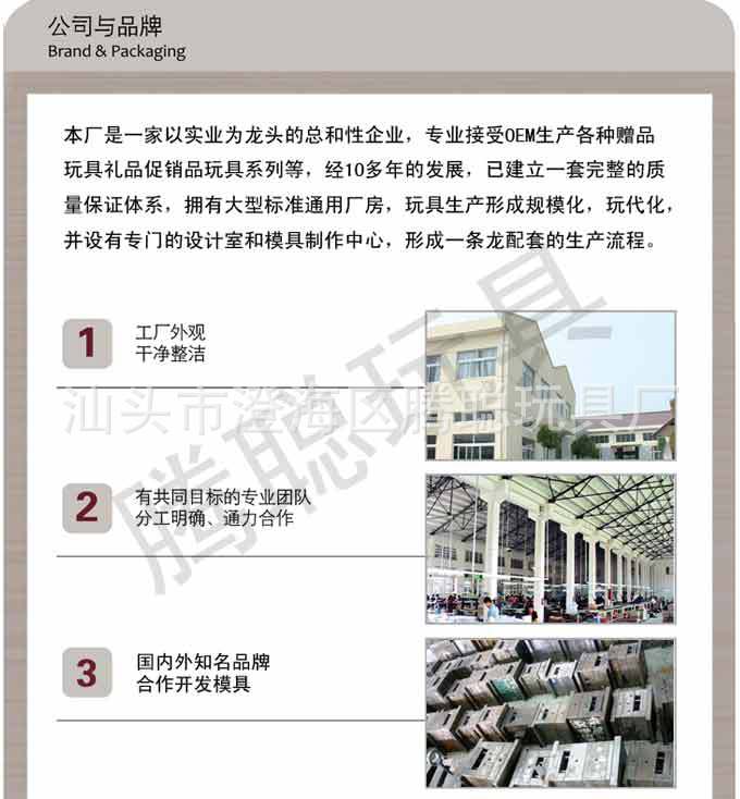 集禮品創意,設計,開發,生產,銷售為一體的工藝禮品制造商。專業生產各種塑膠制品,商務禮品,廣告促銷禮品,文具,玩具等系列產品。公司集設計,註塑,滴塑,印刷,包裝,加工等一條龍服務的最具實力的禮品科技型企業。公司產品遠銷美國,英國,意大利,法國,墨西哥,韓國,日本等國傢地區以及國內各大城市及知名企業。年出口額達500多萬美元。年產值8000萬元.為滿足顧客的需要提供瞭強有力的保障。
