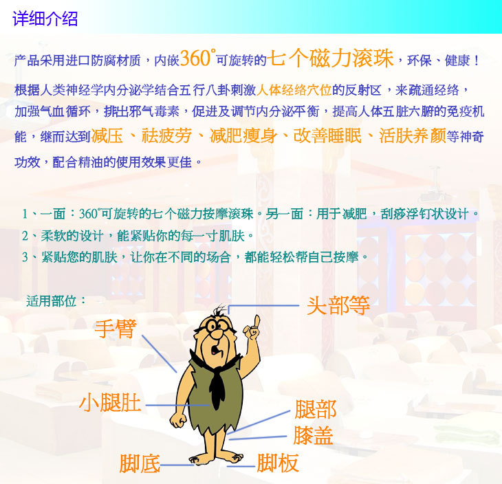 【產品特點】產品采用進口防腐材質,內嵌360°可旋轉的七個滾珠,環保、健康!根據人類神經學、內分泌學結合五行八卦刺激人體經絡穴位的反射區,來疏通經絡,加強氣血循環,排出邪氣毒素,促進及調節內分泌平衡,提高人體五臟六腑的免疫機能,繼而達到減壓、祛疲勞、減肥瘦身、改善睡眠、活膚養顏等神奇功效,配合精油的使用效果更佳。