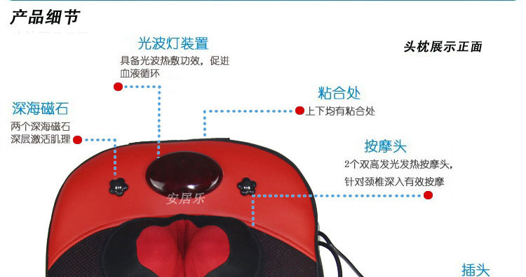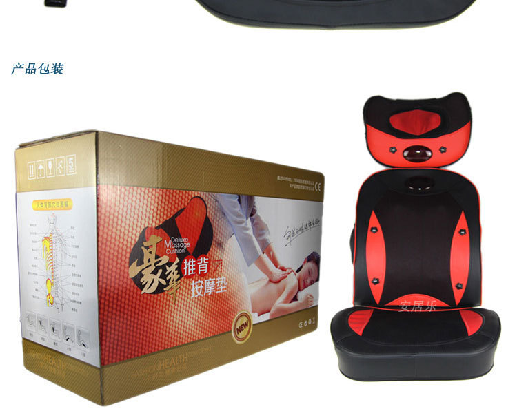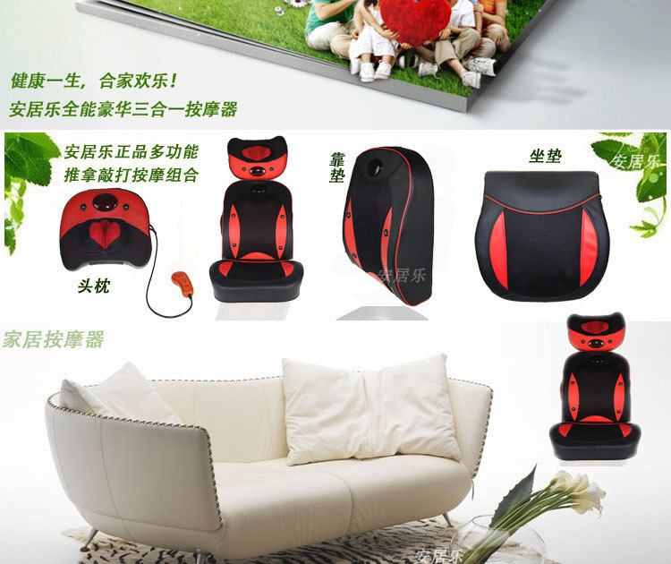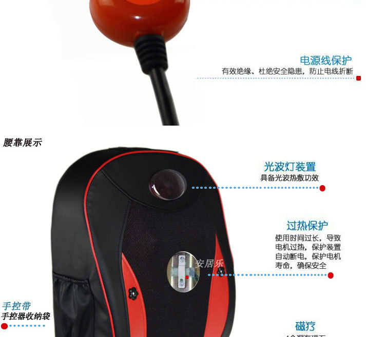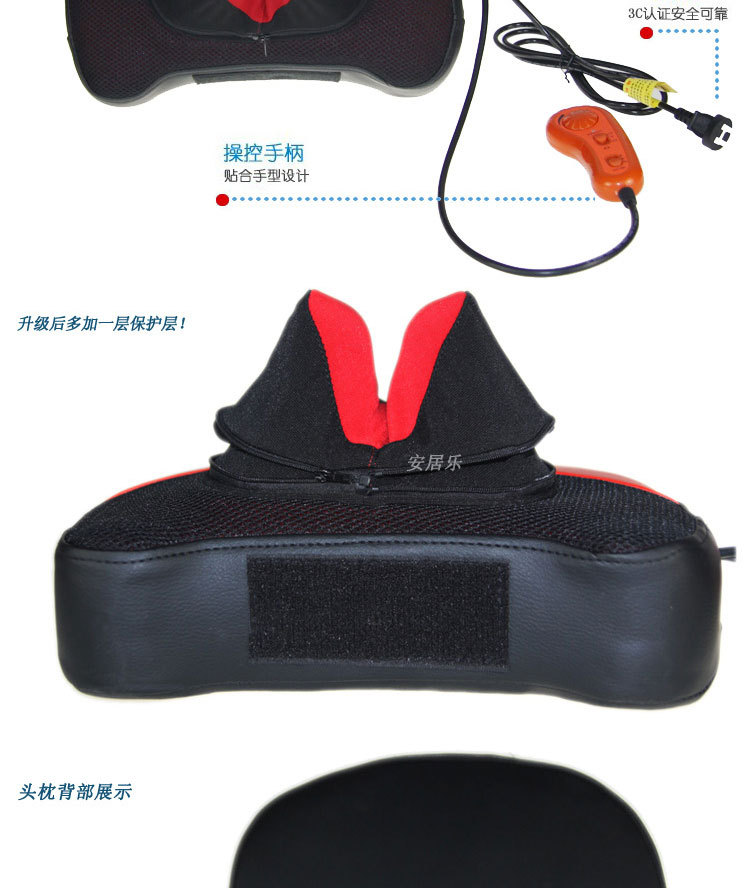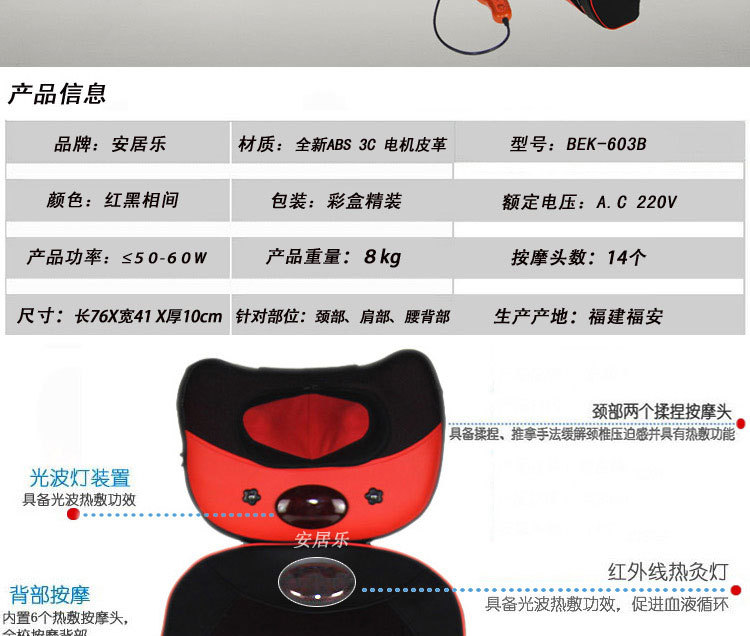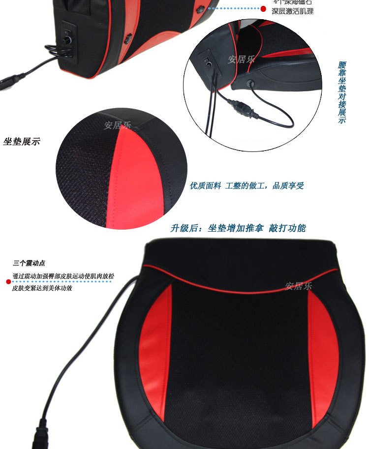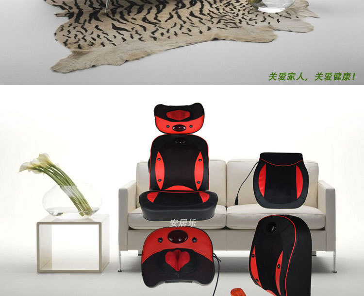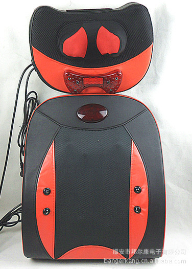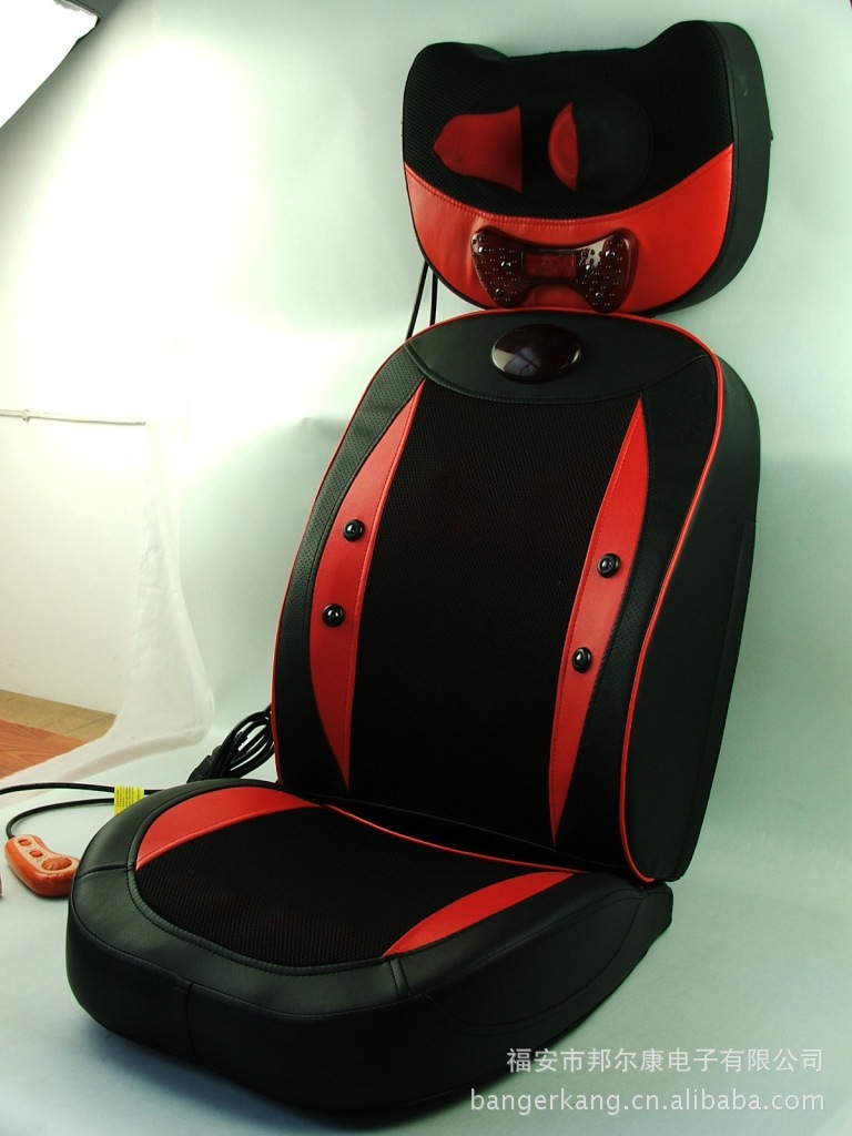 2、頸部兩個紅外熱敷高按摩球,腰椎部十二個高低不同球狀按摩頭(兩組推拿、揉捏機構,腰部設有獨特的正轉推拿,反轉捶擊功能)能有效代替人工按摩,舒展全身緊張的筋骨和肌肉,減輕人體的緊張和壓迫感,使全身舒暢無 比,更能促進全身的血液循環,加快新陳代謝,從而達到防病保健強身之效。采用優質T/C飛梭刺繡面料(耐臟、耐磨,易清洗,不褪色、不脫落)及增強PU皮革(柔韌性好,耐熱性好,延展性好,無毒無污染,使用時間長)