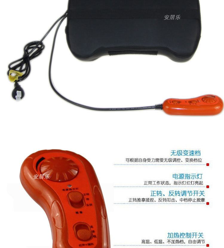 4、獨特的無級調速不分擋數。速度可根據個人身體需要手動調節,讓使用者享受更合理的按摩樂趣。紅外熱敷溫度兩擋可調,讓您的按摩隨心所欲.