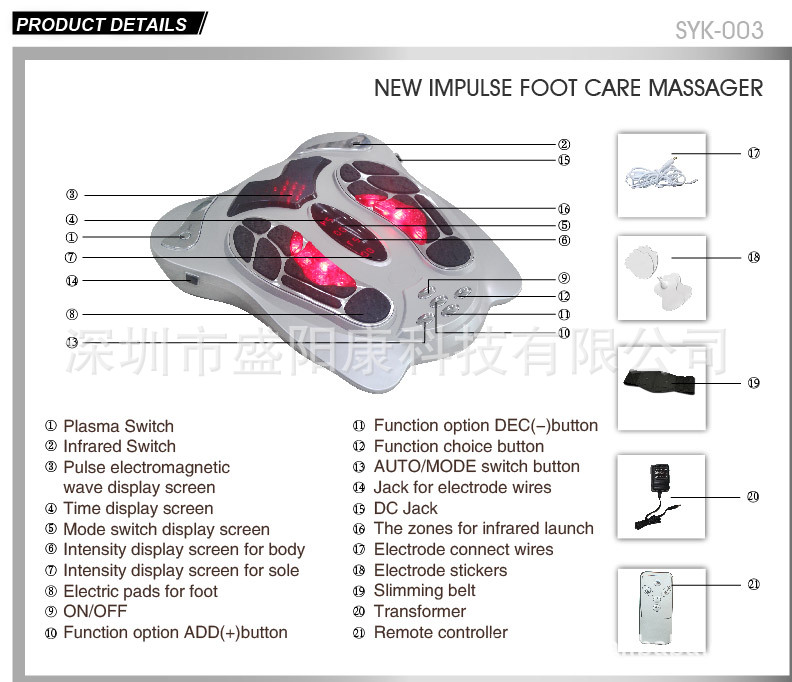 主營按摩器,減肥腰帶,治療機,排毒機,按摩棒,按摩墊,數位經絡治療機,足底電療機,腳部按摩器等保健用品。 我公司是一傢高科技的集團公司,前身香港盛陽康實業有限公司,主要致力於保健按摩器材和高科技電子產品研發和生產.公司現有的十餘個部門構建出瞭公司完善的生產規模.在科學管理的基礎上,公司憑借著自己雄厚的經濟實力,敏銳的市場洞察力,快速的行動力,已在保健器材這塊領域占居瞭自己的一席之地,並贏得瞭同行業的贊譽和認可. | ||