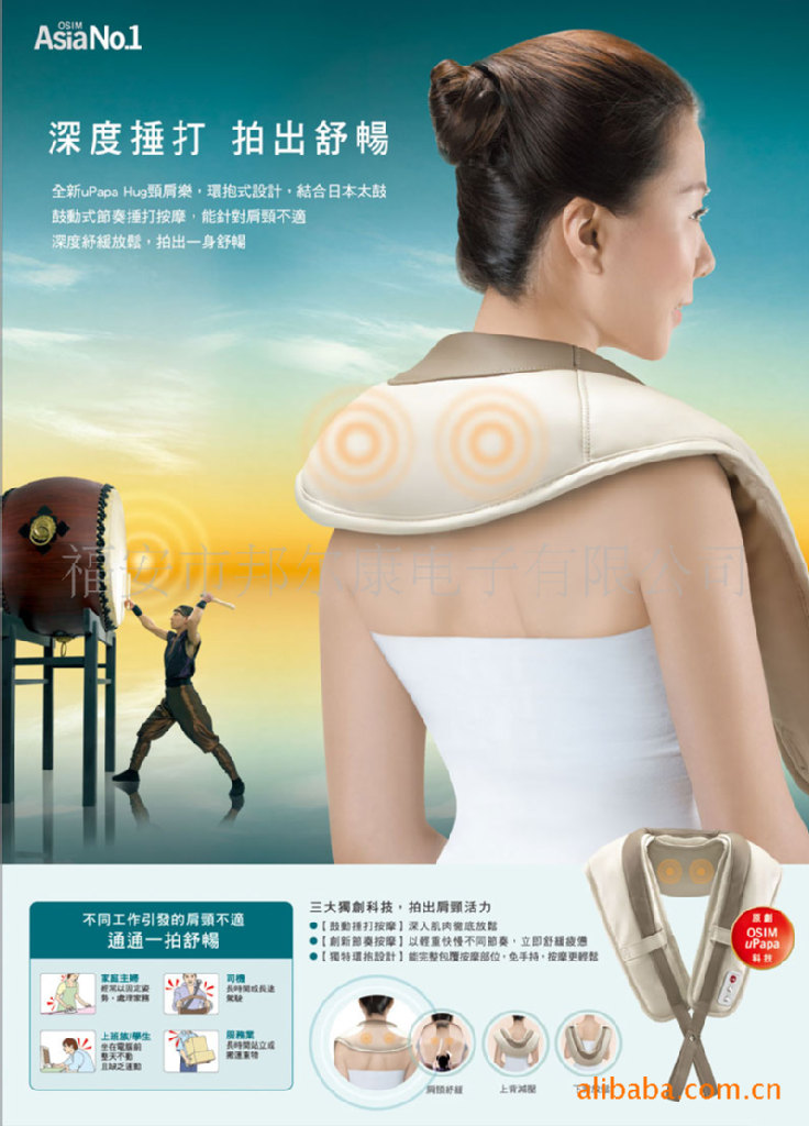 BEK-301A是以日本太鼓為概念,同時創造全新鼓動式節奏捶打按摩,采用貼合身體曲線的環抱式外觀設計,給您更全面,效果更佳,變化更多的舒壓放松按摩。該產品有別於一般的手握式按摩器,按摩時不需隨時手握,可提供身體多個部位的按摩,隻要將頸肩樂包覆環繞於想按摩的部位,再加以松緊,即可享受提振精神,活動無限的按摩。