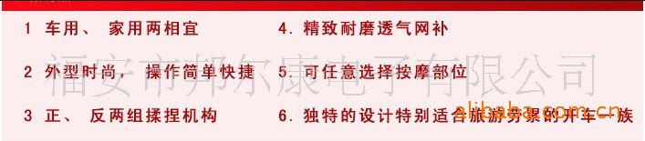 2、腰部六個加熱按摩球,能有效代替人工按摩,舒展全身緊張的筋骨和肌肉,減輕人體的緊張和壓迫感,使全身舒暢無 比,更能促進全身的血液循環,加快新陳代謝,從而達到防病保健強身之效。采用優質T/C飛梭刺繡面料(耐臟、耐磨,易清洗,不褪色、不脫落)及增強PU皮革(柔韌性好,耐熱性好,延展性好,無毒無污染,使用時間長)
