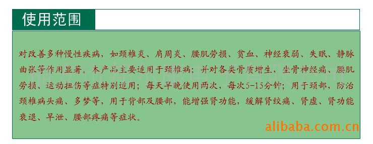 現代都市生活節奏加快,很多人為瞭工作生活,忙碌的生活,加快瞭身體達到負擔,更多人經常熬夜加班,導致身體疲勞,身體各部位器官得不到平衡,因此急需要一款能夠讓身心得到放松的產品,本產品正是能使身體各部位得到放松的一款消除亞健康的產品。上班族職業病、頸椎酸痛、腰椎、肩膀酸痛、眼部疲勞、亞健康、急慢性關節炎、風濕、肩周炎、失眠、鼻炎、神經麻痹、腰肌勞損、月經不調、更年期綜合癥等等