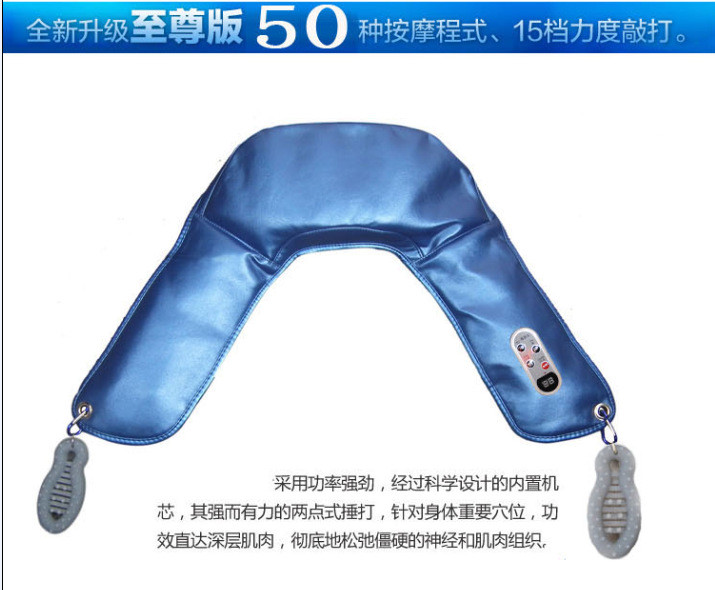 放在頸椎上:有頸椎僵硬,酸痛的朋友們請註意瞭,有時侯為什麼會感覺會酸,會痛,按摩一下就會輕松好多,痛楚自然就減輕瞭,有些嚴重的朋友,會感覺到頭昏昏沉沉的!!一般的按摩器隻能做到,緩解的作用,最大的缺點就是:不方便,捶打按摩披肩現在就為您解決瞭這個問題,您可以在任何形式下都可以按摩您的頸椎,極其方便,隻要隨意輕拉著披肩的手環,就可以輕輕松松的按摩瞭。這樣您再也不怕不方便瞭,隻要一個月,您的頸椎的問題就可以大大減輕瞭,隻要一個 月???為什麼:因為中醫有句古話:通則不痛,痛則不通。所以隻要頸椎上的血液加速在循環,也隻要一個月,您就可以再以也不用痛苦瞭。